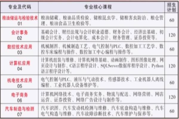 2.高级工:中考文化课成绩达200分(其中:幼儿教育专业为230分;粮食工程、烹饪专业为150分)的应、历届初中毕业生,学制5年;高中毕业生学制3年。